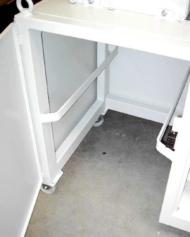 Untergestell für 120 l Standard-Container (nicht im Preis inbegriffen). Der Schaltschrank ist platzsparend im Maschinenrahmen integriert.
