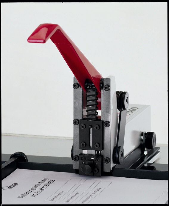 Die sehr robuste manuelle Heftmaschine ist als Tischmodell zur Blockheftung mit Handbedienung oder als Standmodell zur Block- und Sattelheftung mit Fußbedienung erhältlich.