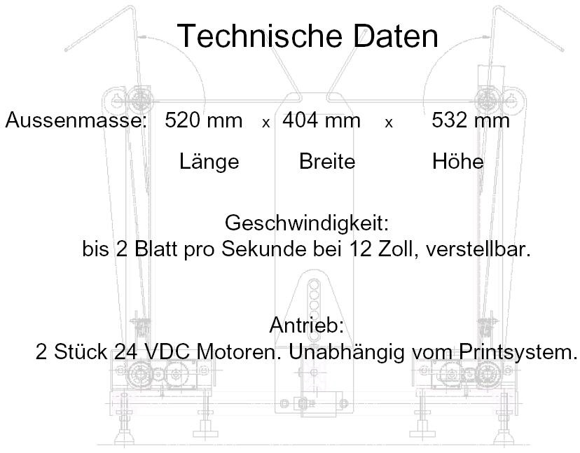 | Antrieb: | 2 Stück 24 V Motoren mit Netzteil, unabhängig vom Printersystem. (Das Netzteil ist im Lieferumfang enthalten!) |