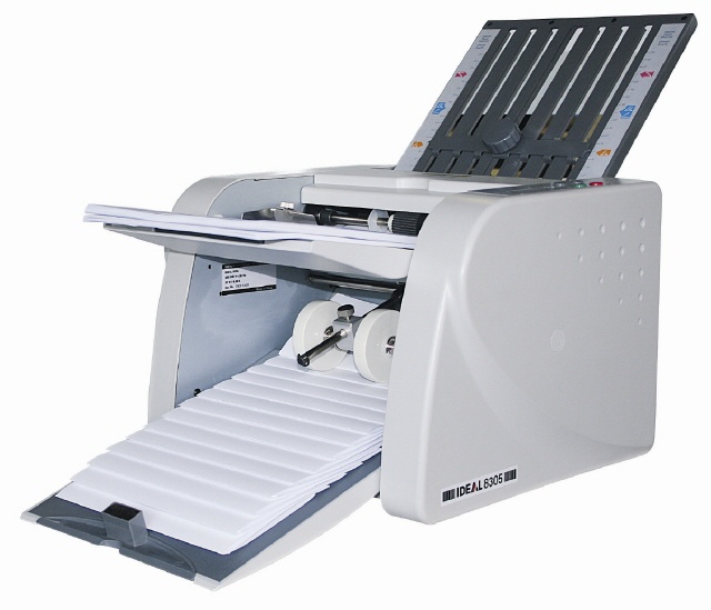 - Büro-Falzmaschine IDEAL 8306 - Bandauslage Geordnete Ablage des gefalzten Papiers durch die Bandauslage mit verstellbarer Papierauswurfrolle. Büro-Falzmaschine IDEAL 8306 - Bedienelement Vier Drucktasten und ein Display für den Total- und Vorwahlzähler ermöglichen eine besonders einfache, unkomplizierte Bedienung.