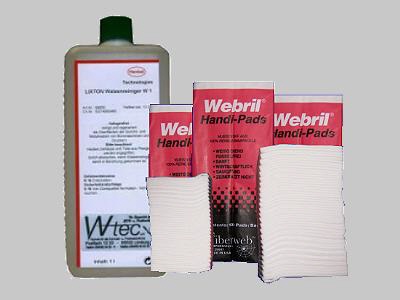 1 x 1 Liter Reiniger für Gummiwalzen Typ W1 und 3 x 100 Vliesstoff Pads, 10x10 cm (= 300 Stück) |